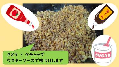 炒めた豚肉に砂糖・ケチャップ・ウスターソースで味つけし,そこに蒸したじゃがいもを入れて火を通して仕上げます。