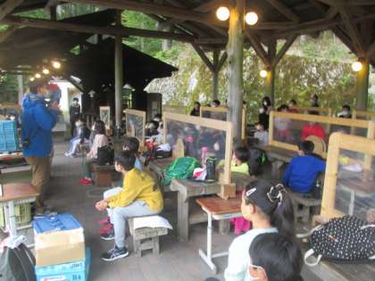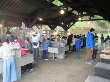 いよいよ花背山の家での最後のプログラム,野外炊事です。雨が降ってきましたが,野外炊事上は屋根があるので,雨が降っていても大丈夫です。