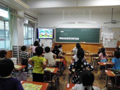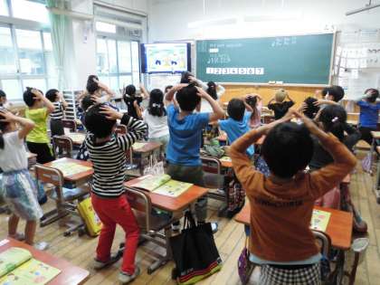 音楽科の授業で,歌いながら踊りました。「チェッチェッコリ」では,だんだん速くなる歌に合わせて,楽しく踊りました。「セブンステップ」の間奏では,自然と手拍子をしている子どもたちもいました。また,教室で踊りたいと思います。