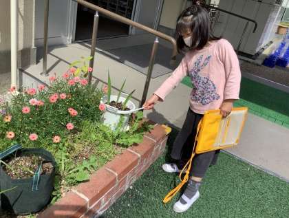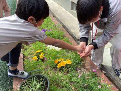 花だんに咲いているたくさんの春の花の中から,写真と同じ花を見つける学習をしました。同じ色でも,色々な種類の花があります。花の形や花びらの数などに気をつけて探しました。ちょうど花が咲いていなかったものも,葉っぱに注目して見つけていました。