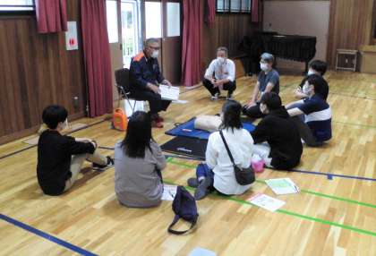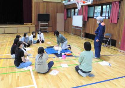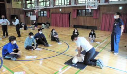 京都市消防局の方々にお越しいただき,胸骨圧迫や人工呼吸・AED使用方法など,心肺蘇生法についてご指導いただきました。お忙しい中,ありがとうございました。