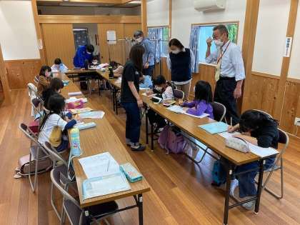 21日の金曜日に,令和4年度「放課後まなび教室」開講式を行いました。2〜6年生までの希望者が宿題や自主学習に取り組みます。開講式の後,早速,課題に取り組んでいました。