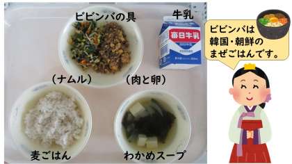ごはんに肉や卵,ナムルなどの具を混ぜて食べる献立で,給食でも人気のメニューです★