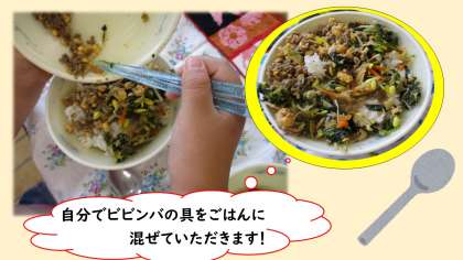 子どもたちは具とごはんを自分で混ぜて,おいしいビビンバを作っていました。