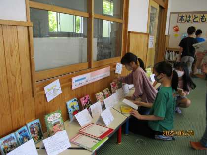以前国語科の学習で,同じ登場人物が出てくる物語をいくつか読んでその人物のみ力を見つけ,シリーズ本の紹介カードを書きました。本といっしょに第2図書館に掲示して,他の学年にも見てもらいます。どんどん借りてもらえるとうれしいですね。