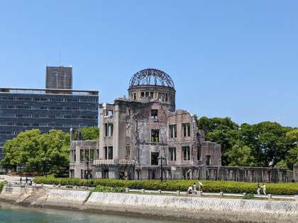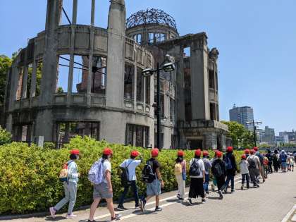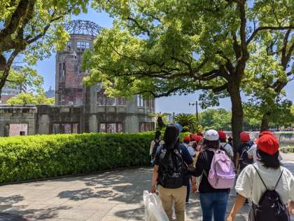 1945年8月6日 8時15分に日本の広島市に投下された原子爆弾の悲惨さを今に伝える建造物である原爆ドームを目の当たりにして,それぞれ感じるものがあったようです。