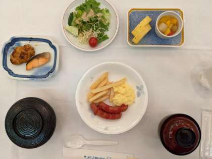 朝食は「焼き魚・ウインナー・味噌汁・卵焼き・サラダ」などなど,夕食同様,たくさんのおかずがあり,しっかりといただきました!