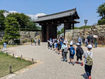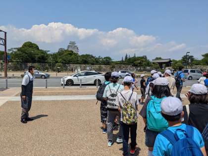 大きな堀,大きな門に驚いていると,更に雄大な姫路城が見えてきました!あまりの大きさに歓声があがりました!