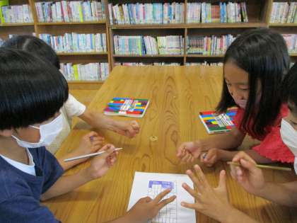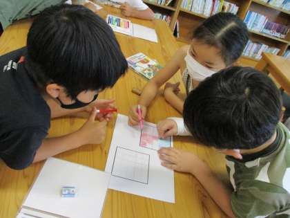 図書館で用意したのは「陣取りゲーム」です。じゃんけんで勝った人がマス目に色を塗っていき、どちらが広い陣地をとれたかをきそいます。低学年用と高学年用があり広さを比べるときの難易度が違います。どのように広さくらべをすれば公平なのかを考えながらゲームを楽しみましょう。2年生は早速お昼休みに友達と遊んでいました。