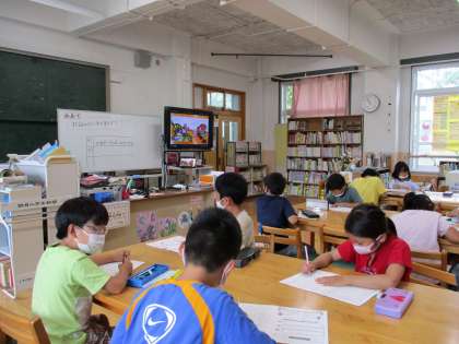 今回ははじめに本の題名を見ずに、読み聞かせを聞きました。聞いたお話の内容から「自分が作者だったらこんな題名にしたいな」と題名を考えて交流しようというものです。「動物たちとかたつむりのかけっこ」「かたつむりがいちばん」「1ばんはだれだ」「おそいこははやいこ」などたくさんの題名を思いついていました。(「だれがいちばんはやいかな」マイケル・グレイニエツ作)
