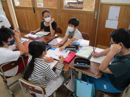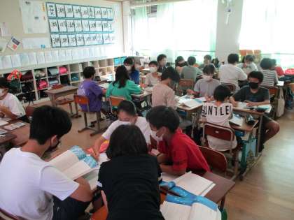 6年生の国語の学習では,宮沢賢治の作品である「やまなし」の読取りの学習に入りました。今日の学習では,登場人物について確認し,5月のシーンのイメージをグループごとにまとめる学習を行いました。