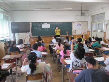 算数・体育・外国語活動の学習を見ていただきました。外国語活動では,文房具の言い方に慣れ親しむ学習をしました。算数では,2ケタで割る割り算の筆算の学習をしました。子どもたちは外国語活動が好きで,元気に英語の発音を楽しんでいました。
