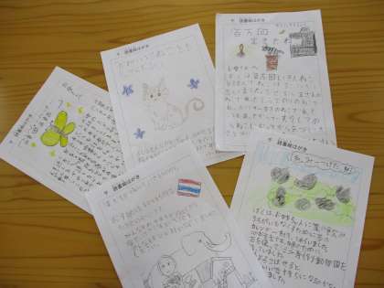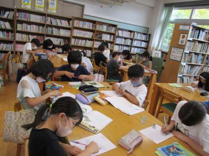 今週は複数の学年で「読書絵はがき」を書いています。本を読んでおもしろかったこと、感動したことなどを絵や文章で伝えるものです。子どもたちはお気に入りの本を手に取って「主人公の勇気があるところが好き」「このセリフが感動した」「人を喜ばせるとこんな気持ちになるのかな」などの思いを表現していました。一部の作品は京都市図書館が行う秋の「読書絵はがき展」に応募します。