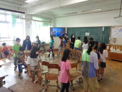 『じゃんけん列車・伝言ゲーム・いす取りゲーム』など、学年を超えて楽しんでいました。