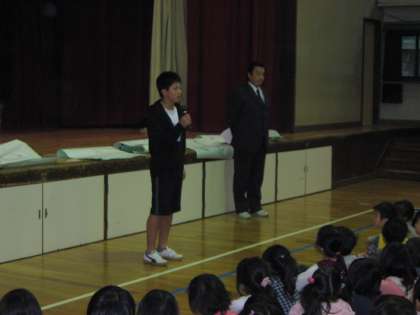 朝会では,学校長のお話に続いて,西京高等学校附属中学校から来ているお兄さんの自己紹介をしました。このお兄さんは金閣小学校の卒業生で,中学校の「生き方探究・チャレンジ体験(職場体験)」により本校に来ています。今週1週間だけですが,子どもたちへの関わりなどについてたくさん学んでほしいと思っています。