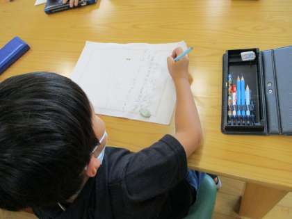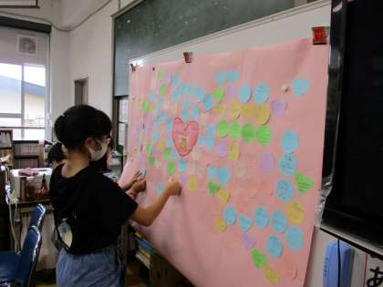 みんなで1冊の本を読んで心はどこにあるのか考えてみました。一つではない答えに子どもたちは自分と向き合いカードに書いて貼りました。「(胸)ポカポカして元気になるから」「(耳)みんなが話す大切な声が聞こえるから」「(言葉)きつい言葉、やさしい言葉があるから」「(目)心が見えるから」「(体全体)気持ちはいろいろなところで表現できるから」などすてきなカードがたくさんありました。図書館に掲示しておきますので違う学年の友だちの考えも見てみましょう。1年生はこの本で読書感想文を書いています。(「心ってどこにあるのでしょう?」こんのひとみ作)