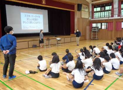 4年生は、SNSでの文字によるコミュニケーションの難しさやゲーム依存、または、オンライン上で知り合った人と会う危険性など、写真や動画を交えてお話していただきました。