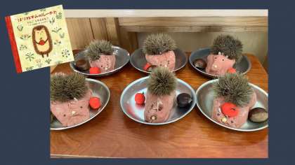 今日の図工は粘土。「ハリネズミのルーチカ」の絵本を楽しんだあとは、「どれがハリネズミかな?クリかな?クイズ」をしました。クリのいがとハリネズミはそっくり!そこで、粘土でつくった体に、いただいた栗のいがをつけて完成させました。目鼻や耳は、生活科や理科の学習で見つけた野菜や花の種を使いました。とってもかわいいハリネズミたち、最後は、絵本にでてきたりんごを食べさせてあげました。