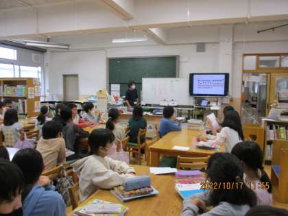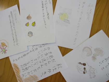 みなさんは秋のどんなところが好きですか。5年生は清少納言の気分で自分なりの秋らしさを文章に表しました。「秋は金木犀。近くを通るとにおうあの甘い香りはいとをかし」「秋はきのこ。旬の楽しさいとをかし」「秋は望月。あたたかく光る満月がいとをかし」など季節を感じる豊かな1時間を過ごしました。カードは図書館に掲示し全校で共有します。