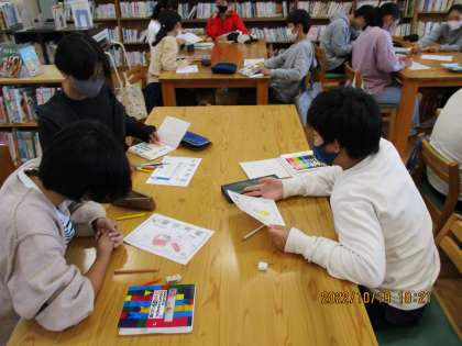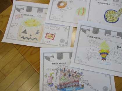 はじめに秋に関係する難読漢字に挑戦したり、秋の食べ物について知ったりしました。その後、秋の食材をもとに行列のできるお店のメニューを考えました。子どもたちは店長になりきって人気メニューを考えます。「あふれだすふわふわかぼちゃカップケーキ」「秋の幸せケーキ」「まつたけのステーキ定食」「カリカリもみじチップス」「あつあつさつまいもグラタン」など、どの店長のメニューもとてもおいしそうでした。言葉をうまく使って食べたくなるようなネーミングにも工夫しました。(参考「ぎょうれつのできるレストラン」ふくざわゆみこ作)