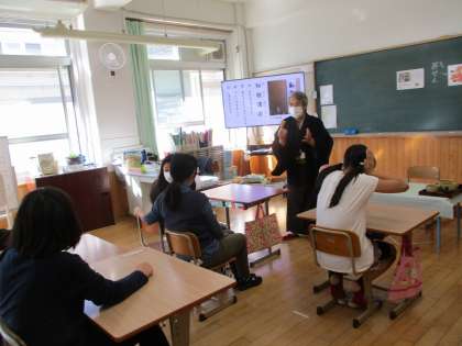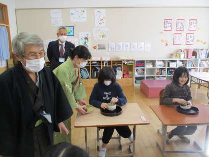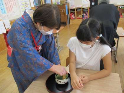 今日は、講師の脇田先生に来ていただき茶道体験を行いました。先生のお手本を見せていただいた後、自分たちでお茶を点てました。自分が点てたお茶を飲んだり、季節の和菓子を食べたりして、和の心を学習しました。