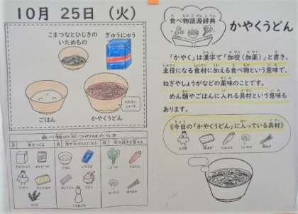 本日の献立は「小松菜とひじきの炒めもの、牛乳、ごはん、かやくうどん」です。