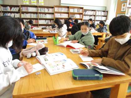 自分がイメージした冬の言葉を一つ選び、本を使いながらカードを書きました。「絵馬」「こたつ」「福笑い」「雪合戦」「あかぎれ」などいろいろな言葉のカードができました。カードに書かれたたくさんの言葉は、図書館前に掲示して他学年の子どもたちも見ることができるようにしています。