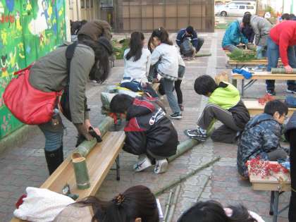 ミニ門松づくりでは,作り方の説明の後,それぞれがのこぎりを手にして竹を切りました。子どもたちもおうちの方たちの手を借りながら,がんばっていました。学校長をはじめ,本校の教職員もがんばりました。