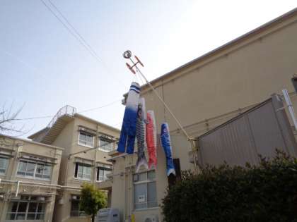 金閣小学校の二つの門にこいのぼりが飾ってあります。もうすぐ端午の節句。こいのぼりの季節です。子どもたちもこいのぼりを見てうれしそう。こいのぼりは子どもたちを高いところで見守ってくれています。