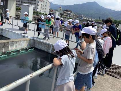 松ケ崎浄水場の見学に行きました。琵琶湖からやってきた水は濁っていて「きたないなあ。」薬を入れてかき混ぜるところでは「洗濯機みたい。」と、子どもたち。