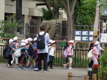 1年生が遠足を楽しみにしている姿ってほかの学年とは少し違いますよね。やっぱり初めてって、いいものです。動物の話やお弁当の話など、動物園に着くまでにたくさんお話をしました。そして、たくさん一緒に動物を見ました。わたしが一番うれしかったのは、ゾウを見た瞬間「校長先生、ゾウがいる!」ってみんなが言ってくれたことです。それがうれしくてうれしくて・・・。お弁当の時間も、みんなが私にお弁当を見せてくれました。