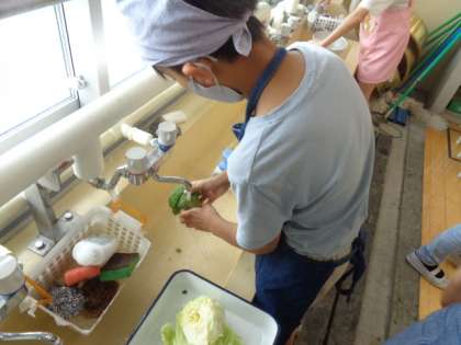 「ゆで野菜サラダ」の調理計画を立て、いよいよ調理実習開始☆まずは、手順を確認し、野菜を洗う所からスタート!!