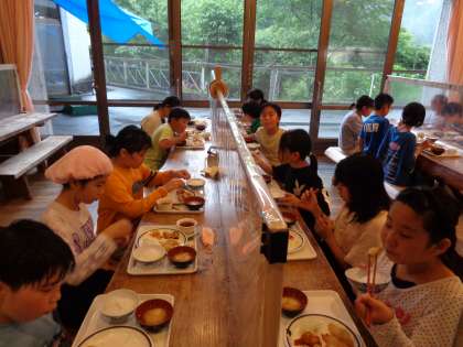 夕食の時間になりました。夕食もバイキングスタイルです。子どもたちは「おいしそう!」と大喜びでおかずをとっていました。そしていただきます。食欲旺盛な子どもたち。しっかり食べました。「おいしい!」と言って笑顔で食べる子どもたちはやっぱり素敵ですね。