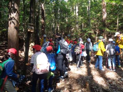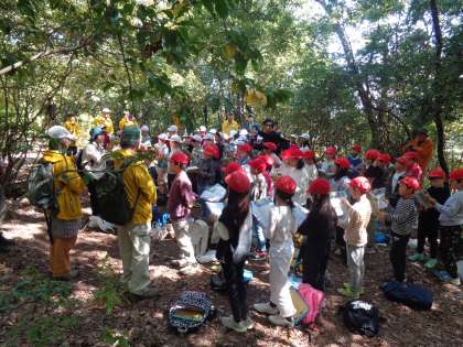 3年生の森林教室がありました。学校の近くの衣笠山に行きました。インストラクターの先生に丁寧に様々な植物について教えてもらいながら山に入っていきました。秋晴れのとってもいいお天気でした。暑いかなと思っていたのですが、マイナスイオンと木陰のおかげで、大変気持ちの良い森林教室となりました。山の中で聴いた3年生の歌はとっても素敵でした。