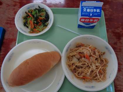 今日の給食はソース焼きそば、小松菜のゴマ油いため、小型コッペパン、牛乳でした。実はソース焼きそばが登場するのは久しぶりなのです。展示食を見た子どもたちは、「今日はパスタや」と言っていました。しばらく出ていないので仕方ありませんね。