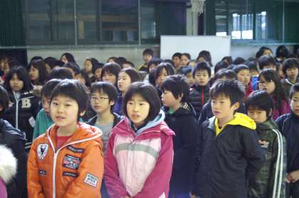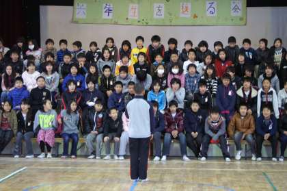 6年生を送る会のしめくくりに,全校合奏「さよなら」を全校児童で二部合唱をしました。