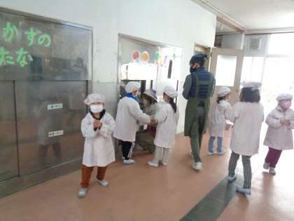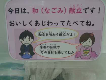 京都市の給食には「なごみ献立」といって、旬の野菜などを使った和食を味わう献立があります。今日は、「ごはん・焼き開干さんま・千切大根の煮びたし・かぶらのみそ汁」でした。旬のかぶらはとっても柔らかくておいしかったです。さんまもご飯が進みました。和食っていいですね。