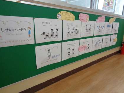 保健室前の掲示板には、姿勢体操の仕方が掲示されています。姿勢が悪いと様々な部分で悪影響が出てきます。また、大人になっても影響が出続ける場合もあります。正しい姿勢ができるよう体操をして、楽しく健康に学校生活を送ってほしいです。