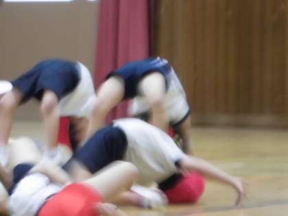 雨のため,講堂で体育をしました。音楽に合わせてトンボになったり,スキップ,ゴロゴロ…色々な生き物や物に変身しながら,身体ほぐしをしました。雨天時,本日のように毎回講堂が使えるわけではありませんが,雨でも体育の用意は必ず持たせていただきますようお願いします。