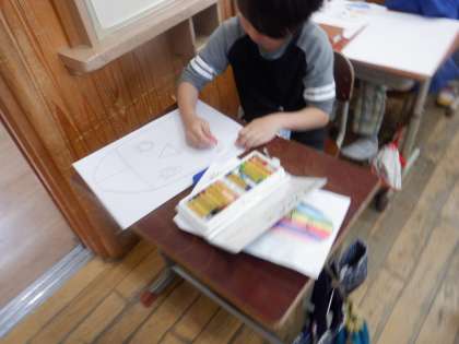 図工の時間に,ふしぎなたまごの絵を描きました。大きなたまご,小さなたまごと形も色々ですが,もようも,記号や星,曲線をつかったもの,縁取りをつけたり,たまごが割れた時に出てくるものまで考えて描いている子もいました。次の時間は,パッカーンと割れたたまごから何が出てくるのかを描いていきます。子ども達の想像力に驚かされると共に,仕上がりがとても楽しみです。