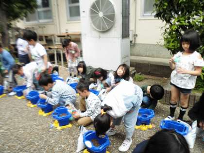 昨日,アサガオの種をまきました。植木鉢に土と肥料を入れ,指であけた穴に一粒一粒まいていきました。まきおわると,そっと土をかけ,そこにペットボトルに入れた雨水タンクの水をやさしいシャワーにして大事そうにかけていました。芽が出るのが楽しみです。