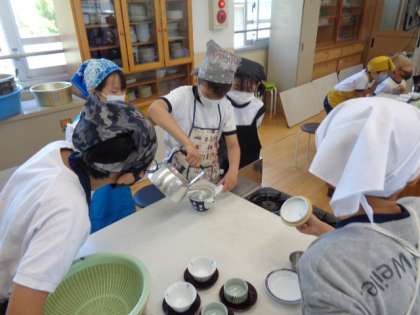 安全なガスこんろの使い方を知り、グループで協力してお茶を入れました。水や茶葉の量を計算したり、同じ量や濃さになるようにお茶をいれたりと工夫しながら進めていました。後片付けも分担し、とってもスムーズに調理実習をすることができました。