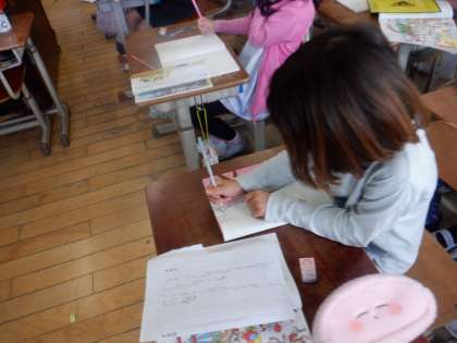 算数は「時こくと時間」の学習に入りました。何時に起きて,何時に家を出て時に学校へ着いたのか…自分自身の生活を振り返るところから始めました。「起きた時こく〜家を出た時こくまでの長さを時間といい,長いはりが一目もり動く時間を1分という」といった大人からすると当然だと思えることですが,子ども達にとっては???というところです。生活の色々な場面で,時こくと時間を意識できるようお願いします。