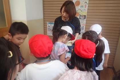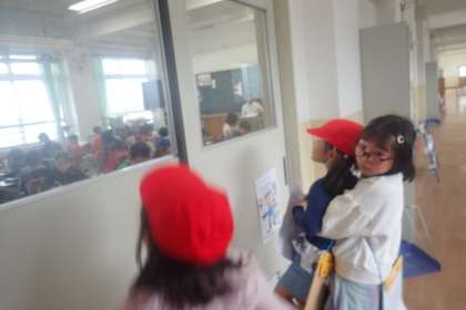 今日は,2年生に学校たんけんに連れて行ってもらいました。お迎えに来てくれた2年生に,名前を呼ばれると,にこにこして手をつないでもらって,出発していきました。1年生だけで行ったことはありましたが,何をする部屋かをていねいに説明してくれたり,実際に室内に入れたりしたので楽しかったようです。高学年の学習している様子が見えるようにと,抱っこしてくれているグループもありました。