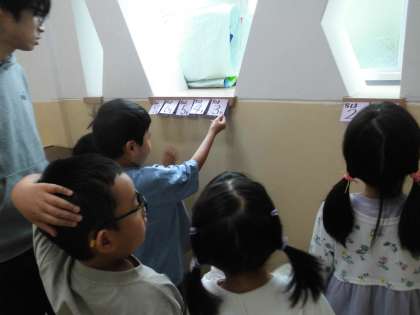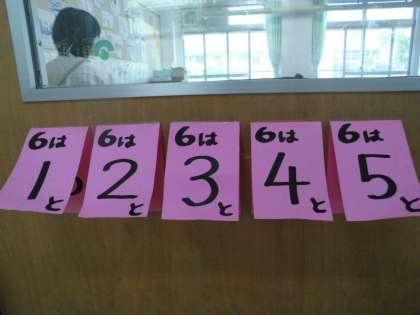 算数は【いくつといくつ】の学習に入り,授業でも宿題でも「9は,8と1に分けられます。」「9は,7と2に…」と,数字を変えて繰り返し練習しています。算数の時間だけでなく,休み時間や,すきまの時間にも数字にふれ【いくつといくつ】が,スラスラ言えるようにという思いで,教室の出入口や廊下にも数字カードをはっています。おうちでも,色々な機会を見つけて「いくつといくつ?」たずねていただけたらと思います。