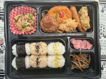 近くの芝生でお弁当です。曇り空でそこまでは暑くありません。
