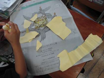 新聞紙や包装紙,おり紙をそっとやぶいてできた形を見つめていると,動物に見えたり,洋服に見えてきたり…それを貼り合わせ,目やボタンなど必要なものを描き足していきました。仕上がりが楽しみです。