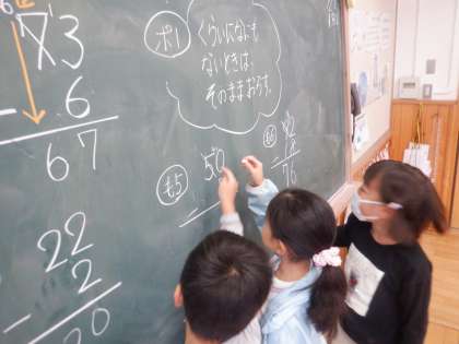 算数は「ひき算の筆算」の学習をしています。繰り下がりのある二桁の計算では,一の位で引けない時は「十の位から1繰り下げて…」と,唱えながら計算していきますが,位取りがきちんと書けていなかったり,繰り下げたのを忘れていたりと,二年生にとっては,なかなか難しい学習ですが,互いに教え合いながら学習を進めています。