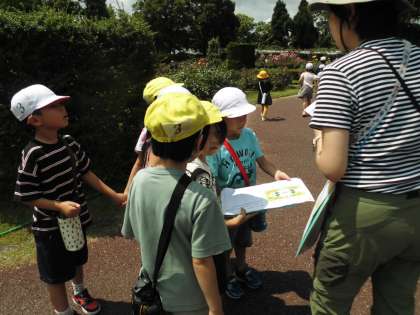 【ラリー1】お天気が良すぎて少し暑い中,みんなで仲良く回り,各ポイントでシールを貼ってもらい大喜びでした。