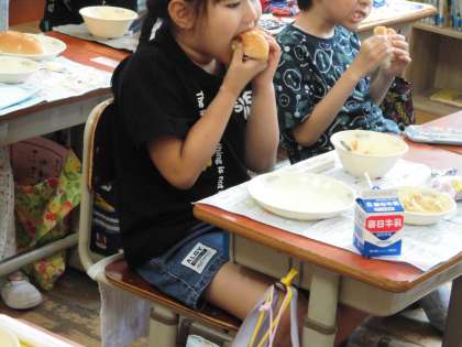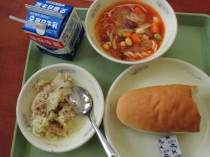 今日の給食は,コッペパン・ツナサンドの具・ミネストローネ・チーズ・牛乳でした。コッペパンに切れ目を入れて具をはさんで,手作りサンドにして食べるという献立です。トマト味のスープとの取り合わせも好評で「めっちゃ,おいしい。」と,もぐもぐパクパク…何と,みんな時間内に完食で,チャイムの前に「ごちそうさまでした。」